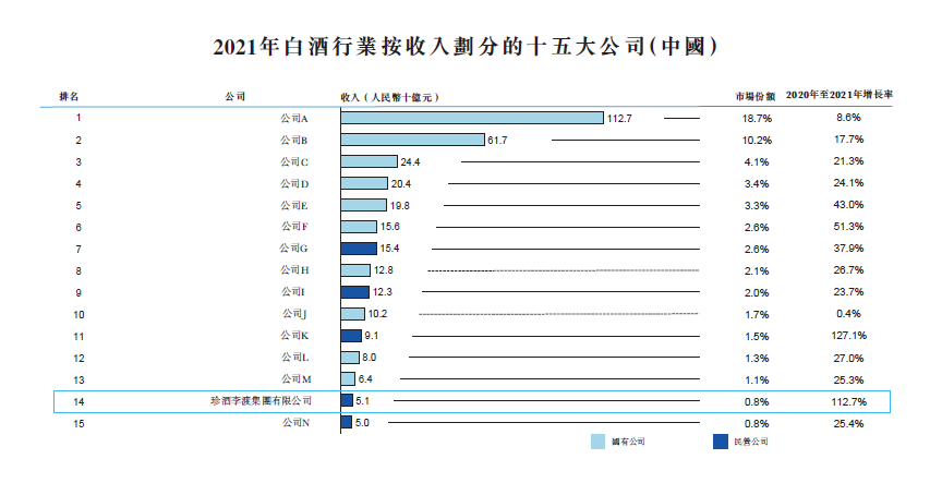 中国白酒行业是一个规模庞大且市场参与者分离的行业,按地理区域、价格范围及香型明确划分。于2021年,中国白酒行业市场规模达到人民币6,033亿元。于2021年,按收入计,15大公司占总市场份额的56.2%。