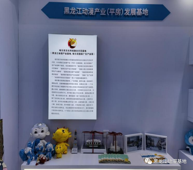 本次文博会上基地展示了以3D打印为技术核心的老哈尔滨特色模型及文化创意衍生品,将文化创意、地域文化完美结合,实现为文化产业和创意设计赋能。同时,还展示了基地的吉祥物“拿着画笔的小龙”和多家入驻企业原创动画片玩偶形象,其中包括哈尔滨雪娃文化发展有限公司制作的52集动画片《雪娃》动画玩偶形象和哈尔滨品格文化传播有限公司的《云奇飞行日记》原创动画玩偶形象。“雪娃”形象曾获得了国内多项大奖:2009年被哈尔滨市旅游局指定为哈尔滨国际冰雪节吉祥物;2010年被评为“首届金鹏奖中国十大卡通形象;2012年获得文化部“国家重点动漫产品”;2014年7月“雪娃”获得黑龙江省文化产业十大品牌。《云奇飞行日记》,在2012年获得了法国戛纳电视节最佳动画片奖。