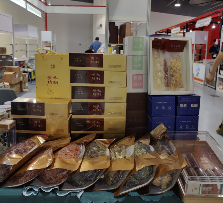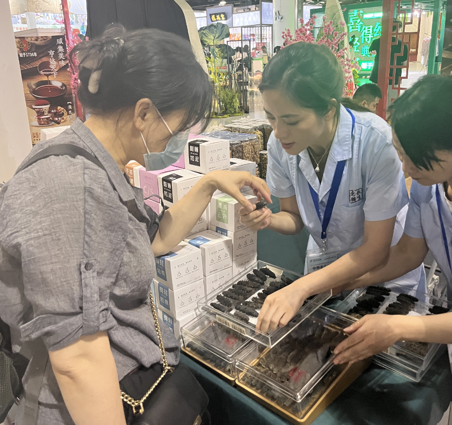 作为一家齐聚中医药、非遗、养生为一体的企业,展会现场推出的产品,不仅有海参、燕窝等滋补品,还有以非遗项目九制黄精制作技艺、墩门工夫茶制作技艺为核心,将花茶与传统医药相结合,研制的双非遗融合茶品——九制黄精红茶等系列养生茶品;