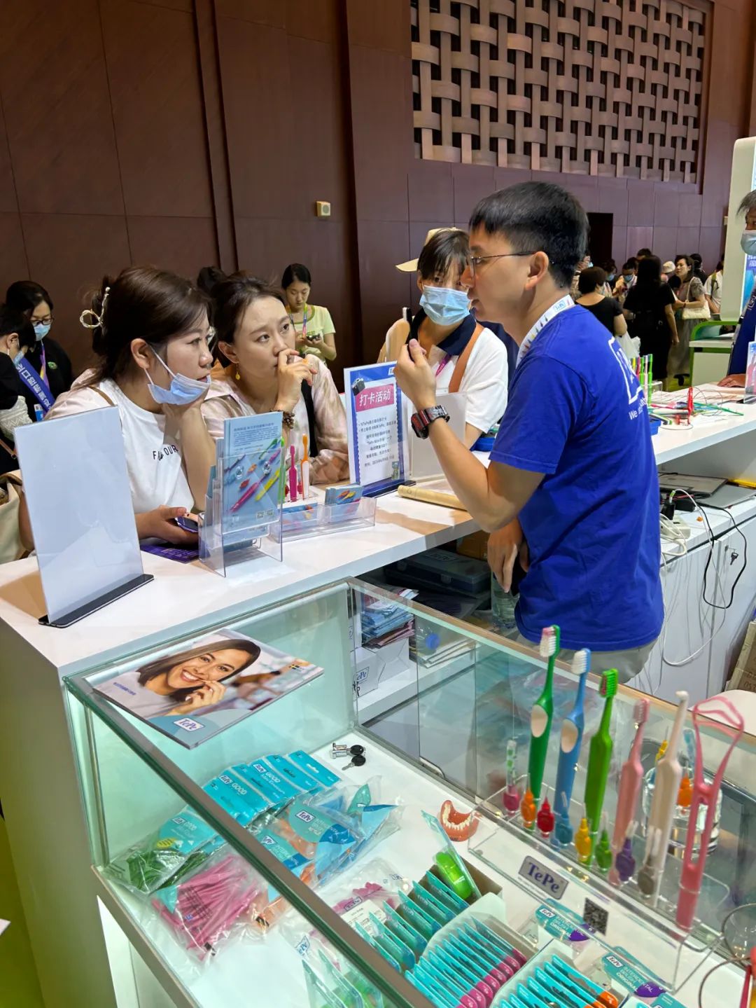 展台促销活动优惠多多,来自五湖四海的观众们反响热烈。现场的工作人员用心的讲解每一款产品的使用方法和销售方案。顺利完成现场成交,还有TePe小套装赠送噢!