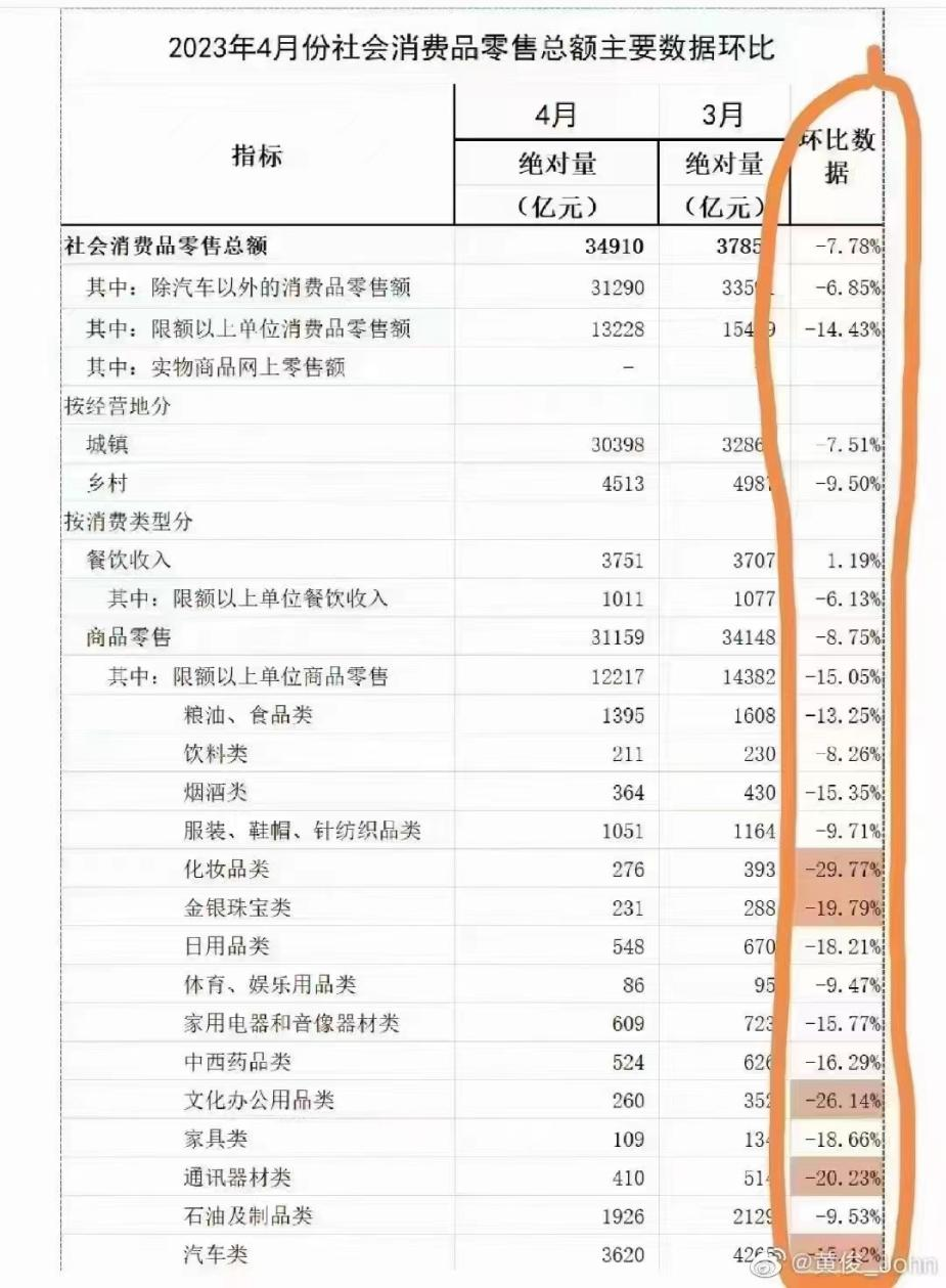 据国家统计局消息,2023年4月份,社会消费品零售总额34910亿元,同比增长18.4%。但细分来看,商品零售环比数据下降8.75%。其中,粮油、食品类、饮料类等都有不同程度的下滑。