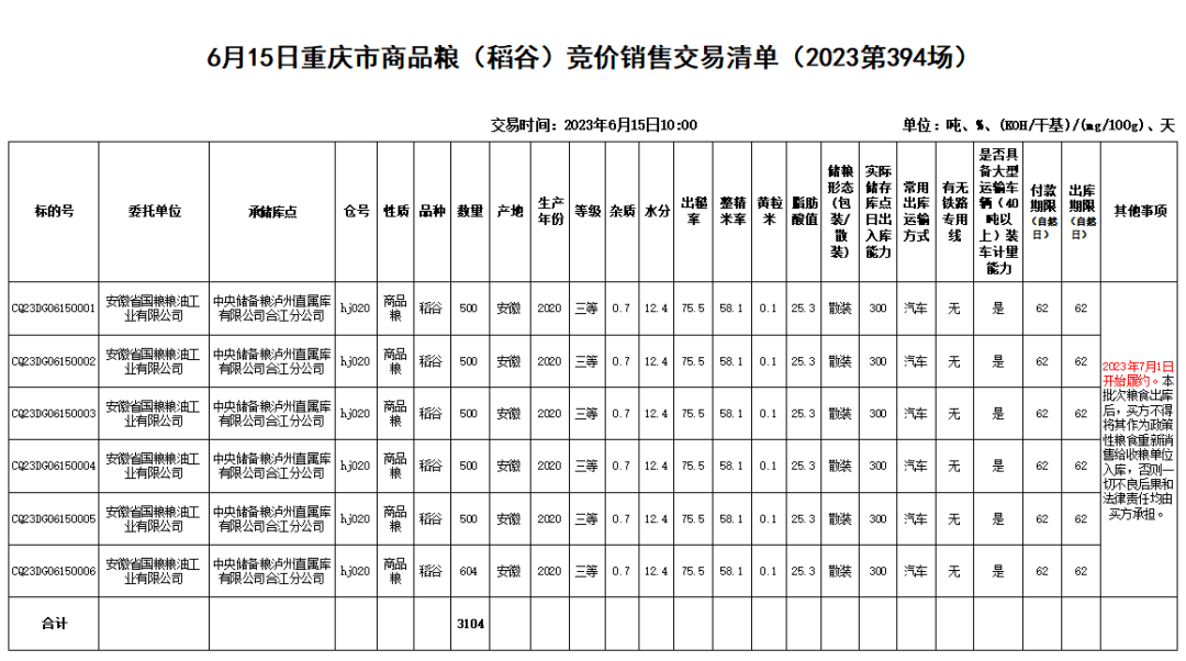 2. 报名时间:2023年6月15日8:00前。报名参与交易即视作全面承认并遵守《重庆市地方政府储备竞价销售交易规则》和交易公告、交易清单等要求。
