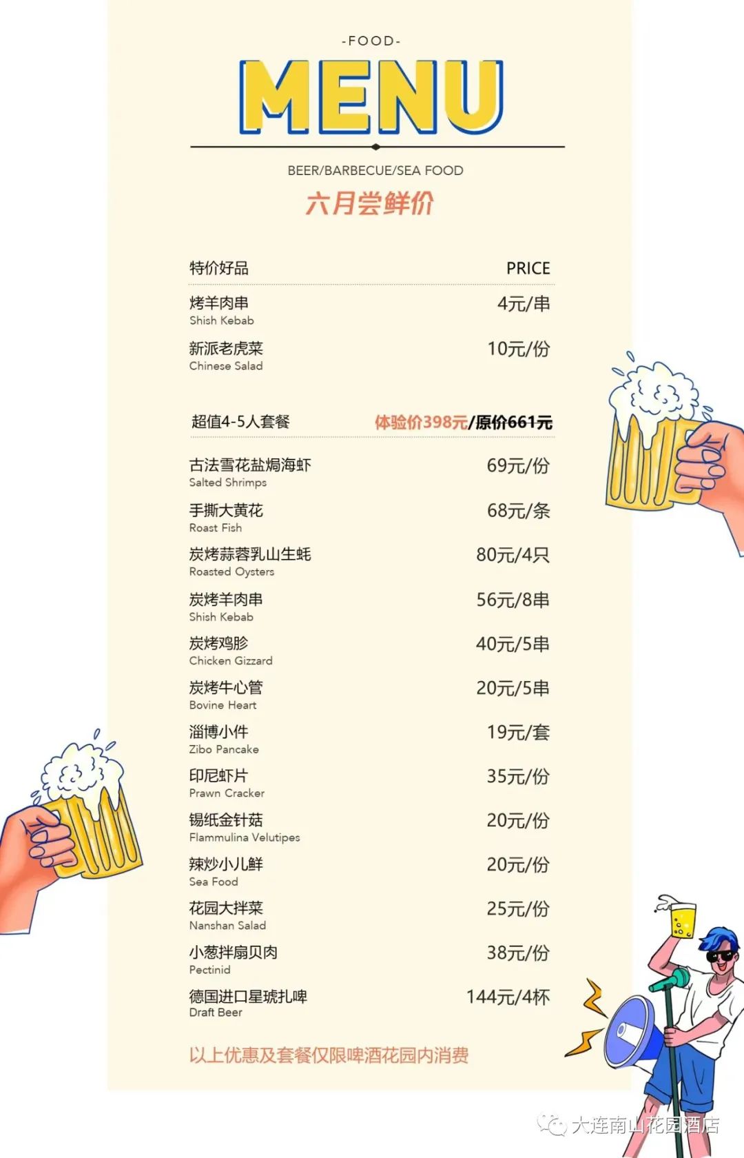 活动一:每桌限量可点一套原价661元套餐,限时特卖价398元(会员券除外) 活动二:在啤酒花园用餐的客人即享六月开业专宠价(会员券除外) 羊肉串 原价7元(限时折扣价4元) 新派老虎菜 原价25元(限时折扣价10元) |
