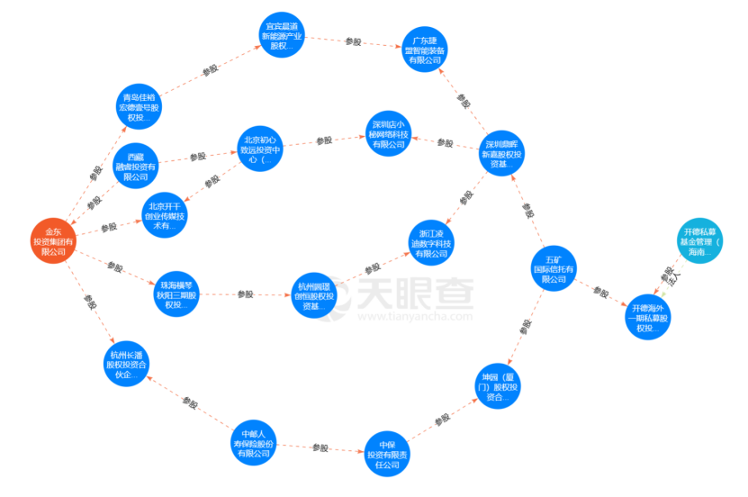图表:华致酒行发展节点,来源:公开信息可以肯定的是,比起上市后的高光时刻离场,KKR这次难道又“翻车”了?毕竟华致酒行上市两年股价翻了五倍,实在称得上是潜力股。往事暗沉不可追,我们好奇的只是,号称华尔街之狼的KKR为什么会在踩雷后再次携手吴向东,难道华尔街之狼被白酒教父“灌上头”了?KKR不傻,吴向东与KKR的关系也并不像看起来这么简单。吴向东的白酒版图,除了曾经在大众视野出现的金六福、华致酒行和珍酒李渡外,还有一个叫做金东投资的集团。这个集团主要以白酒产业链作为发散点进行投资,截至目前,该集团直接投资企业43家,穿透后的对外投资企业高达321家,投资链条可堪复杂。另一边,KKR全资在华设立了一家私募基金,名叫开德私募基金管理(海南)有限公司。