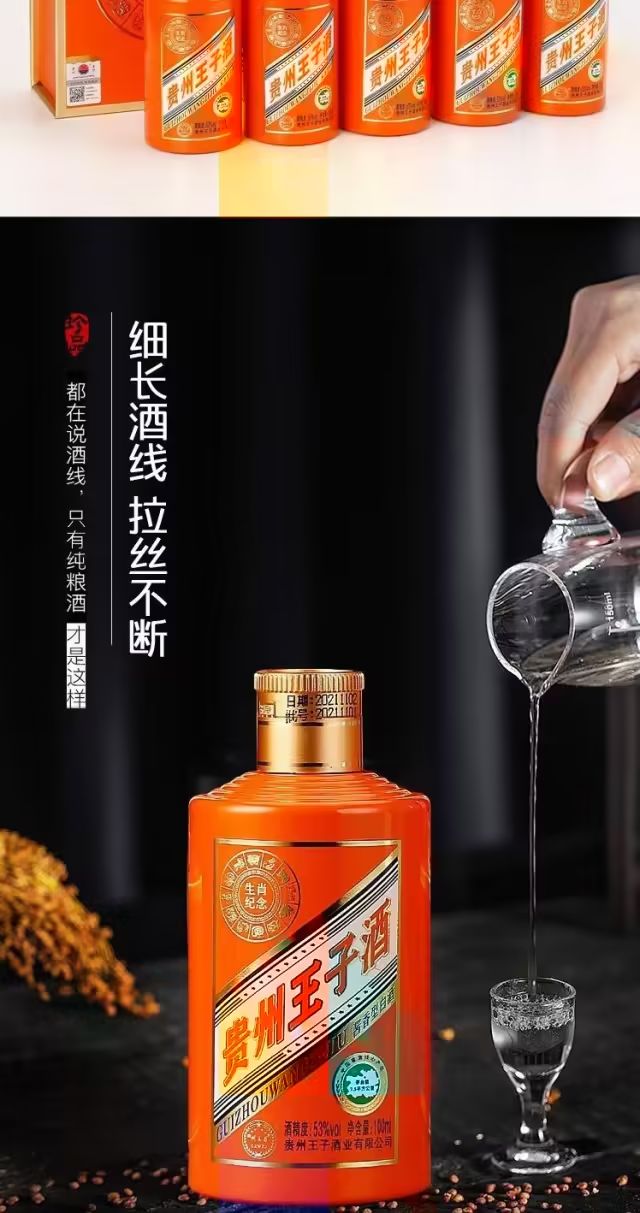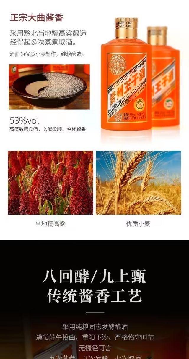 贵州王子酒酒厂严格遵循传统12987坤沙工艺进行酿酒,整个酿造过程包括端午制曲、重阳下沙、二次投粮、九次蒸馏、八次发酵、七次取酒,历经春、夏、秋、冬整整一年时间。酿好的七轮次酒各有特色,再经过储存和勾调,这样的酒才能算是真正的纯粮酱香酒。