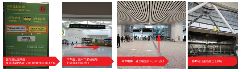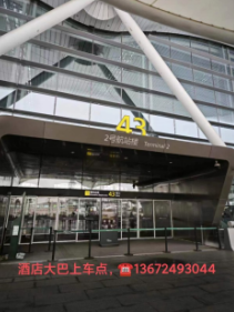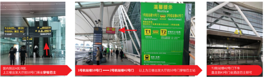 国内到达A区/B区出来后请直接前往3楼出发大厅10号门上车,下车点在T2航站楼42号门直走到43号门上车即可(约30分钟):