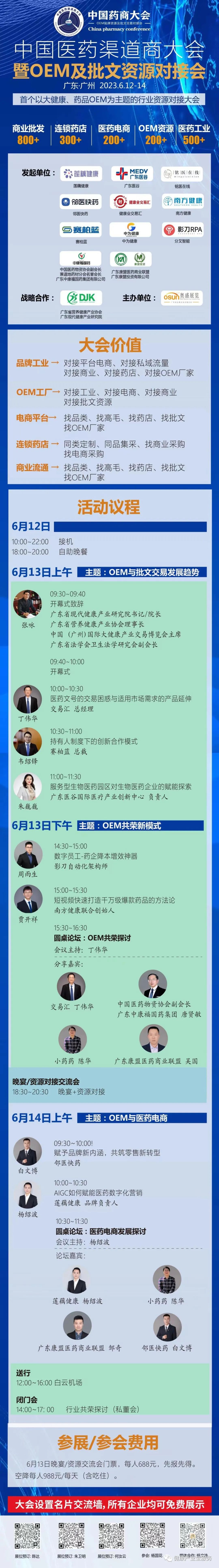 为让连锁、商业、品牌工业、电商拥有更多高毛、控销产品,由多家医药企业联合发起、奥盛展览主办的“中国医药渠道商大会暨OEM与批文资源对接会“(简称:中国药商大会),将于2023年6月12-14在中国广州花都区迎宾大道177号华钜君悦酒店隆重举行。大会将以“OEM资源共享,渠道产销共荣”为主题,助力医药工业开辟销售新渠道、激活沉冗资源;协助医药商业与上下游协同增值,提升连锁药店高毛高利润。
