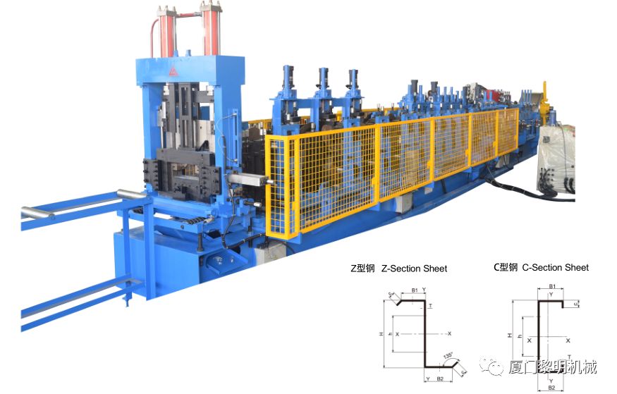 本机是辊压成型C/Z型檩条的专用设备,采用单边架体固定,另一边架体无极调整。单C或单Z采用自动换型。C/Z之间自动切换。檩条的腹板宽度与腰高的调节,通过输入参数进行自动换型的目的。配备前切断与后切断,后切断机构可根据用户的需求配置固定型号剪刀或万能剪刀。前冲孔系统,手动换型。