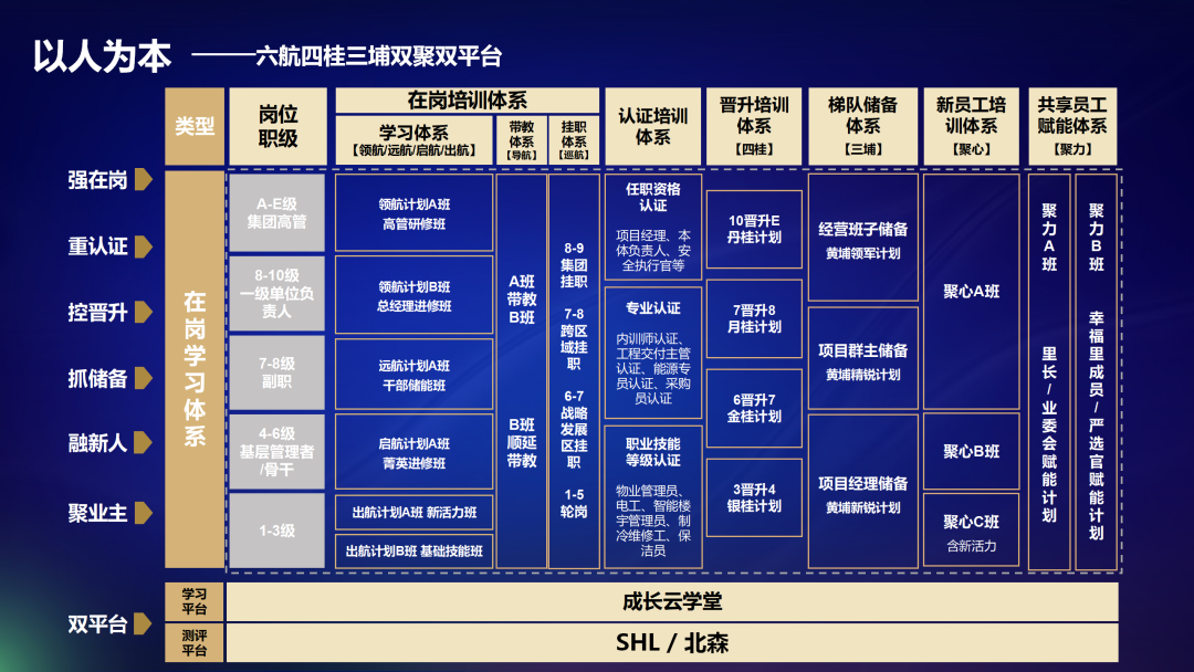 我们现在有13.9万名员工,有3.7亿方的储备面积,在不拓展的情况下,未来三年我们的人数可能超过30万人,如果没有一套完整的人才培养机制,很难保证我们的品质不走样,很难保证企业高速发展,所以我们构建一整套的方式方法,通过不同的条线、不同的人员,在企业、腰部、头部不断地迭代发展。