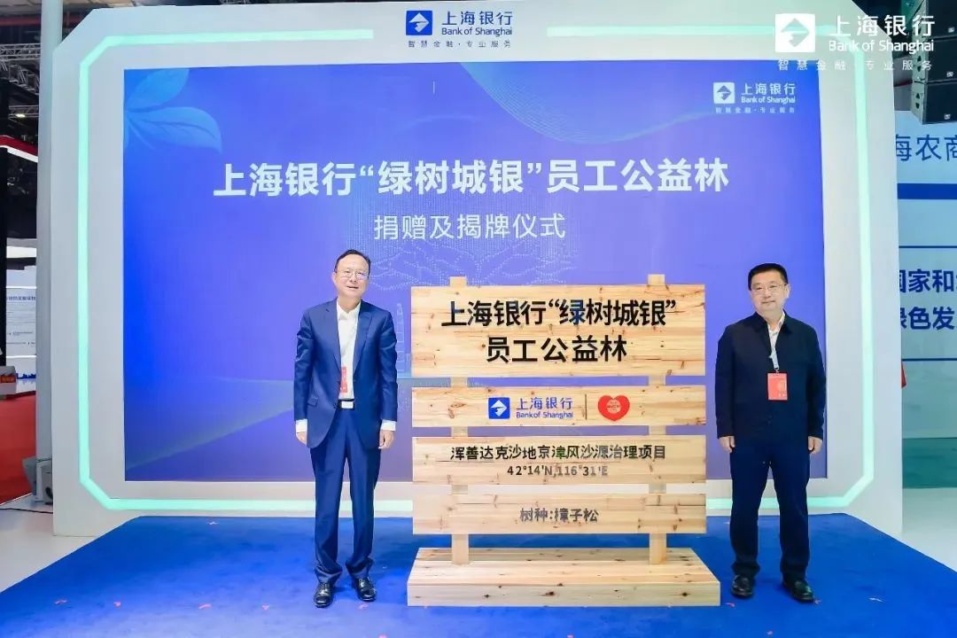 在以绿色金融赋能全社会加快绿色转型的同时,上海银行围绕自身双碳目标,全面推进绿色银行建设,强化绿色运营、绿色行为、绿色采购、绿色价值四轮驱动,搭建绿色低碳运行体系,探索实践自身绿色低碳发展。在碳博会活动现场,还举办了上海银行“绿树城银”员工公益林捐赠及揭牌仪式:在内蒙古自治区浑善达克规模化林场播种“绿水青山”,为京津冀地区筑起“挡沙墙”,为社会减碳尽绵薄之力,践行国企员工的社会担当。