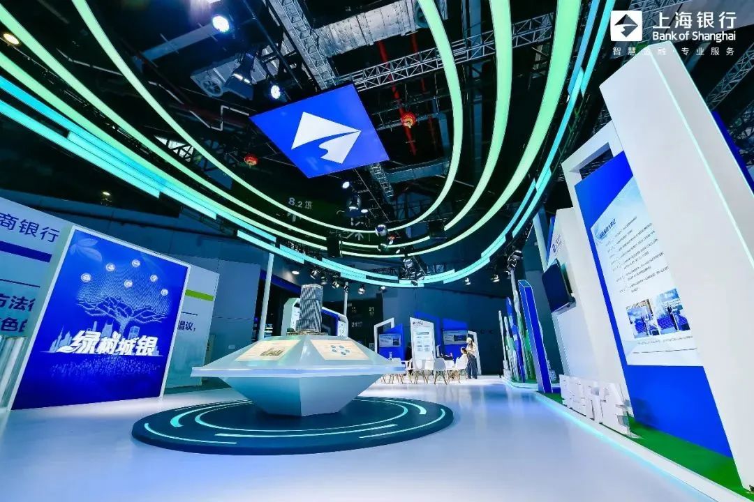 碳博会上海银行展区,整体设计颇有新意:以蓝色和绿色为基调,以“蓝色”突出上海银行视觉形象,彰显精品银行战略,以“绿色”突显绿色低碳活动主题;顶部以“海”为创意,以循环的灯光效果传递海纳百川的寓意,彰显有鲜明绿色底色的精品银行追求。
