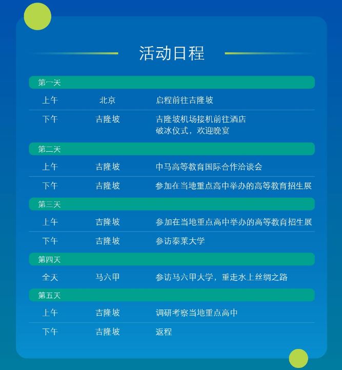 本次活动主会场设立在马来西亚吉隆坡,拟邀请吉隆坡及其他地区近四十余所马来西亚高校参加;并计划在吉隆坡(KL)地区以“多形式教育多边合作”为主题,与马来西亚高校、高中对合作项目及内容可行性进行交流的同时,向其在校生及社会生源进行国内高校优势专业和课程展示、与本地师生近距离接触,鼓励马来西亚学生来华留学等活动。