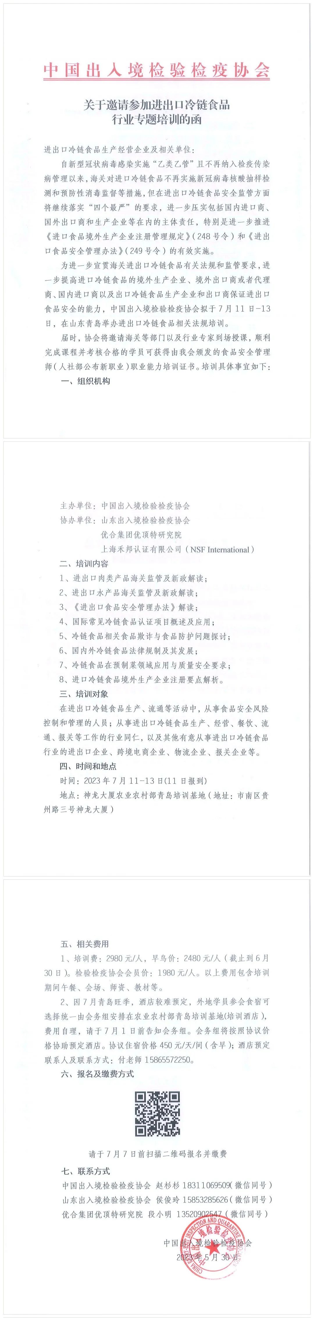 转发《关于邀请参加进出口冷链食品行业专题培训的函》