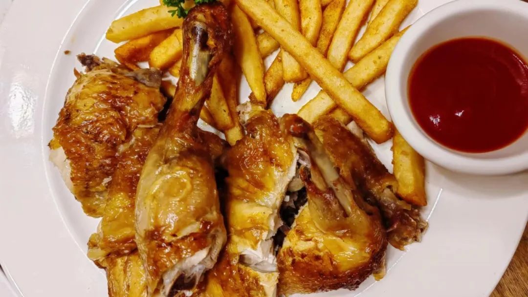 德式烤鸡:准确的说应该是烤鸡腿,这个味道也很不错,火候掌握得也比较好,不会踩雷。就是搭配的薯条,调料面撒得有点多。