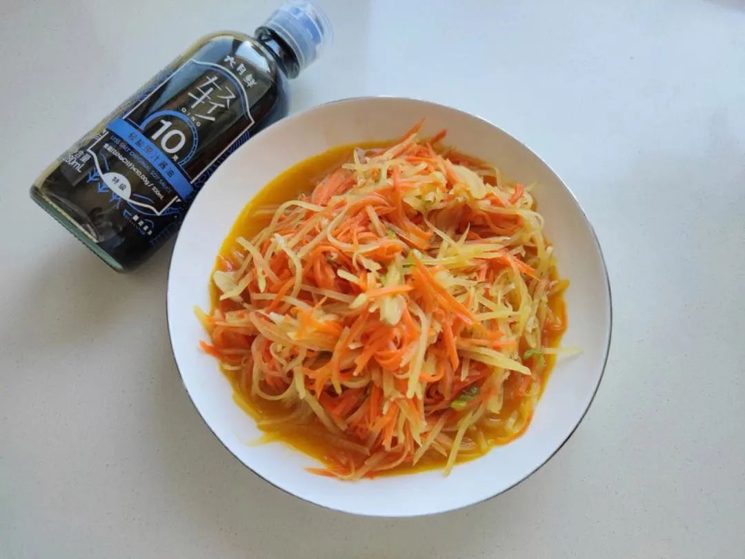 ③胡萝卜土豆丝小炒(马铃薯52g,胡萝卜11g,精肉7g,油4g,盐1g,鸡精0.5g,白砂糖1.5g)