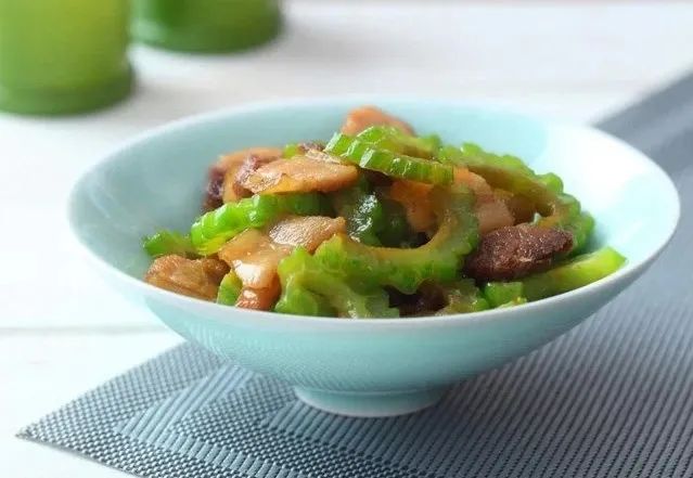 5.倒入葱姜、苦瓜片、大蒜、小火炒出红油,改为大火加少许生抽、糖、少许水不停的翻炒,苦瓜变软即可出锅。