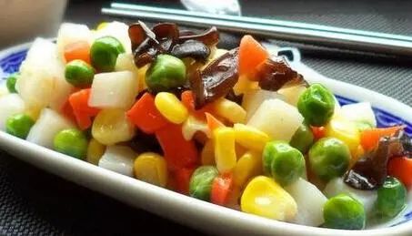 ③五彩蔬丁(玉米粒23g,青豆粒23g,茭白23g,胡萝卜11g,菜籽油4g,精肉11g,盐1g,鸡精0.5g)