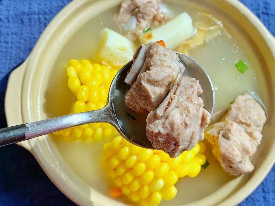 ④玉米仔排汤(玉米52g,仔排34g,盐1g)