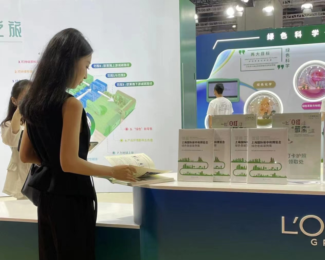读者在欧莱雅集团展区翻阅《首届上海国际碳中和博览会绿色低碳案例集》。