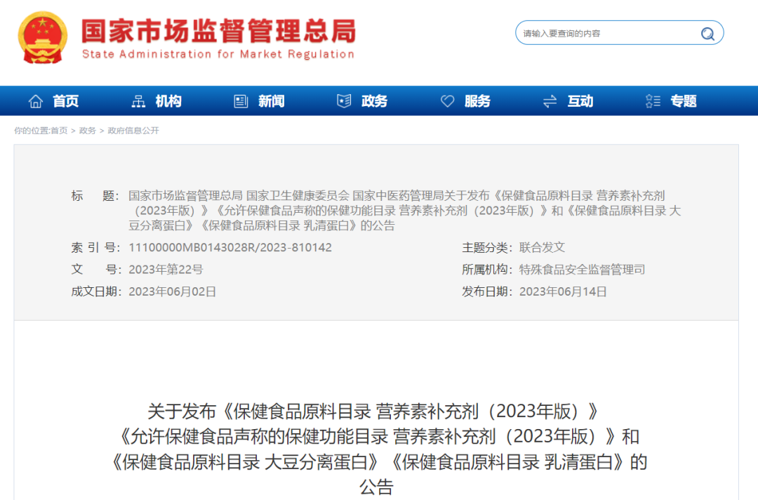 2023年6月14日,市场监管总局、国家卫生健康委、国家中医药局联合发布关于发布《保健食品原料目录 营养素补充剂(2023年版)》《允许保健食品声称的保健功能目录 营养素补充剂(2023年版)》和《保健食品原料目录 大豆分离蛋白》《保健食品原料目录 乳清蛋白》的公告(2023年第22号),公告内容如下: