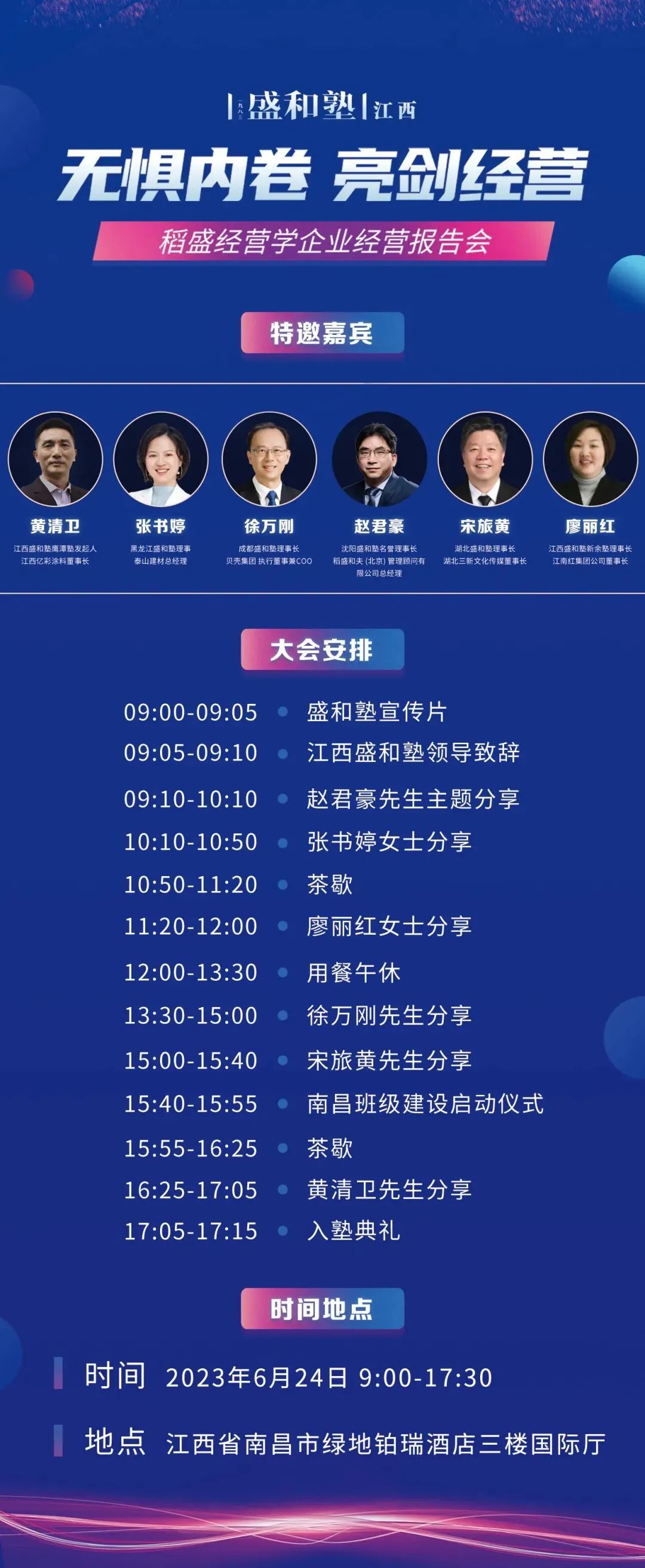 江西盛和塾以“无惧内卷 亮剑经营”为主题的企业经营报告会,将于6月24日在南昌绿地铂瑞酒店会议中心举办,我们诚挚邀请您拨冗参加这一场1000余名企业家汇聚一堂的经营智慧盛宴,一同感受稻盛经营哲学的力量,实现突破发展。