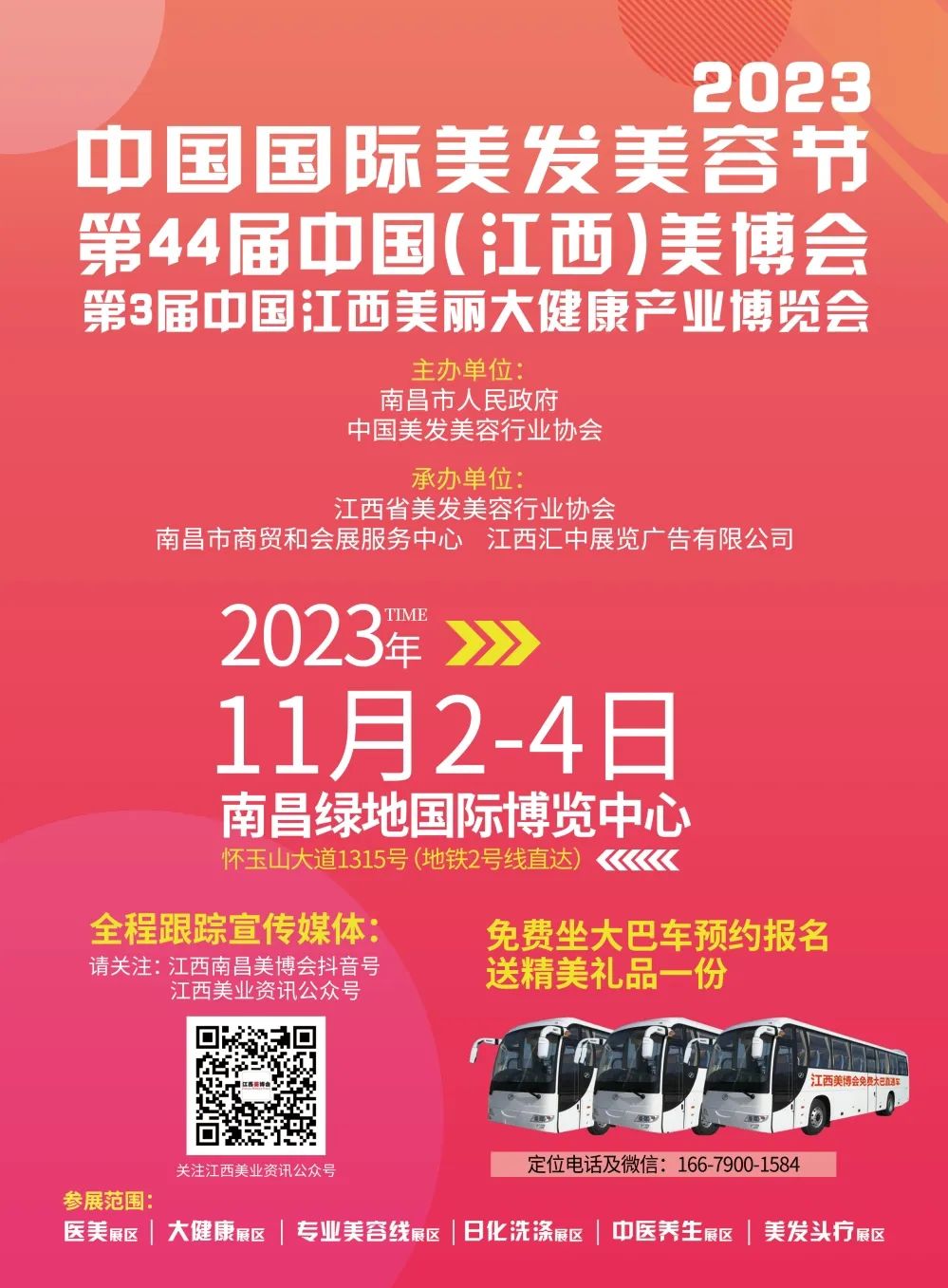 2023中国国际美发美容节,第44届中国(江西)美博会,第3届中国江西美丽大健康产业博览会,将确认举办时间是2023年11月2日-4日,活动地址为南昌绿地国际博览中心。