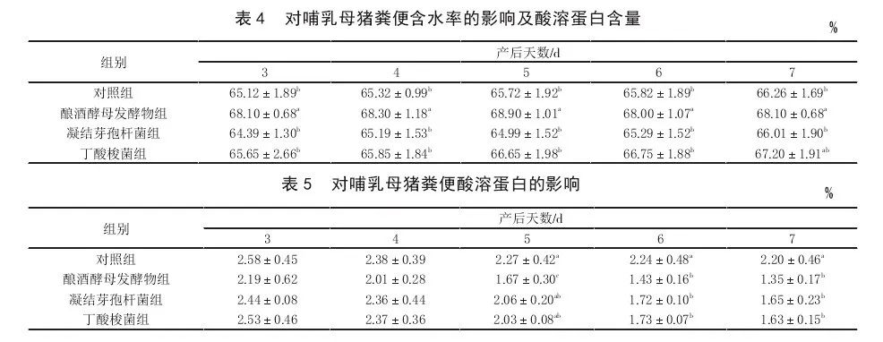 在本试验条件下,日粮中添加丁酸梭菌、凝结芽孢杆菌、酿酒酵母发酵对仔猪初生体重、初生窝重、仔猪断奶成活率影响不显著,但3种添加剂可以显著减少母猪的背膘损失,且日粮中添加酿酒酵母发酵物可以显著提高仔猪断奶窝重。试验结果表明,在哺乳期母猪日粮中添加酿酒酵母发酵物,产后第4天开始采食量显著高于对照组,产后7 ~ 18d采食量显著高于丁酸梭菌组,产后7 ~ 9d采食量显著高于凝结芽孢杆菌组;与对照组相比,添加凝结芽孢杆菌产后13~15d采食量显著高于对照组,且产后13 ~ 15d采食量显著高于丁酸梭菌组;添加丁酸梭菌产后母猪采食量与对照组差异不显著。2.3 3种添加剂对哺乳母猪粪便含水率及酸溶蛋白含量的影响本试验结果表明,酵母发酵物组比对照组、凝结芽孢杆菌组母猪产后第3 ~ 7天粪便含水率显著提高;酿酒酵母发酵物组比丁酸梭菌组母猪产后第3 ~ 6天粪便含水率显著提高。酿酒酵母发酵物组与对照组比母猪产后第5 ~ 7天粪便酸溶性蛋白含量显著降低;凝结芽孢杆菌组、丁酸梭菌组母猪与对照组相比,产后第6~7天粪便酸溶性蛋白含量显著降低;与凝结芽孢杆菌组、丁酸梭菌组相比,酿酒酵母发酵物组产后第5天粪便酸溶性蛋白含量显著降低。在本试验条件下,添加酿酒酵母发酵物后,仔猪血清中总蛋白、白蛋白、球蛋白含量显著高于对照组,但碱性磷酸酶、乳酸脱氢酶活性显著低于对照组,且仔猪血清中总蛋白、白蛋白、球蛋白含量显著高于添加凝结芽孢杆菌组,但乳酸脱氢酶活性显著低于凝结芽孢杆菌组,仔猪血清中白蛋白、球蛋白含量显著高于添加丁酸梭菌组。添加凝结芽孢杆菌仔猪血清中总蛋白显著高于对照组,碱性磷酸酶、乳酸脱氢酶活性显著低于对照组,但仔猪血清中乳酸脱氢酶活性显著高于酿酒酵母发酵物组、丁酸梭菌组。丁酸梭菌组仔猪血清中总蛋白、白蛋白含量比对照组显著提高,但碱性磷酸酶、乳酸脱氢酶活性显著低于对照组。3种微生态制剂均能显著提高血清总蛋白含量,显著降低碱性磷酸酶和乳酸脱氢酶活性,表明仔猪营养吸收能力增强,蛋白质合成水平提高,应激反应减少,有利于仔猪健康生长。