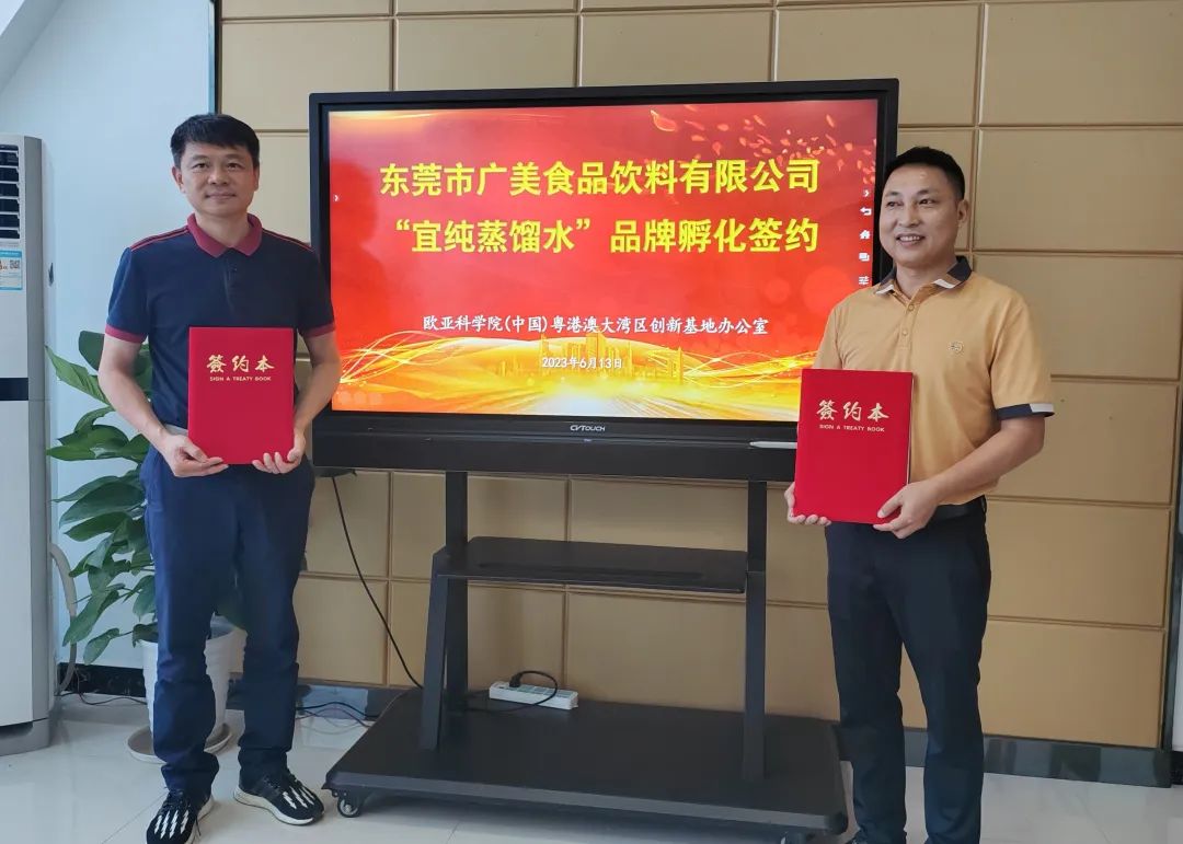 6月13日上午,东莞市广美食品饮料有限公司(下称,广美公司)“宜纯蒸馏水”品牌孵化项目在欧亚科学院中国粤港澳大湾区科技创新基地(下称,创新基地)启动。