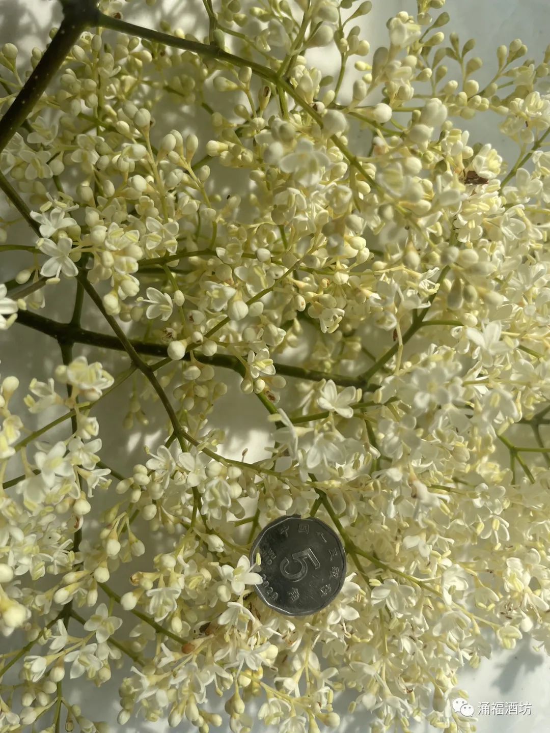 暴马子学名暴马丁香,又叫白丁香或荷花丁香,也有人叫它棒棒木,但山区人更习惯称它为暴马子。主要分布于我国北部地区,它多生长于山坡灌丛或林边、或针阔叶混交林中、或河畔林缘地带。现在看不到成片的树木,只有零星生长,数量较少,生长慢,不易成材。民间传说在没有冰箱的过去,用暴马子木材制作的小厨柜放食品可以延长保质期,现在有些人用来制作茶筒来存放茶叶。在我们吉林省花开时间在每年的6月中旬左右,而且花的品质取决于天气情况,只有在持续高温且阳光明媚的天气时才能采摘下高品质的花,如果花期遇到连续阴雨天气,花的品质就会很差。暴马子花蕾比小米粒能大点,花香怡人。下面有张照片是花朵和5角硬币的对比。