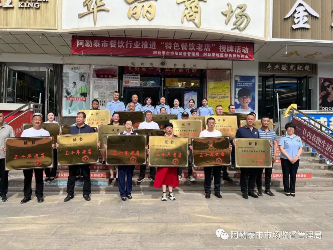 此次活动,评选出“特色餐饮老店”企业18家,其中经营40年老店1家、经营30年老店4家、经营20年老店4家、经营10年老店9家,他们分别是:阿勒泰市银丰砂锅;阿勒泰市小苏椒麻鸡店、阿勒泰市马一绝牛肉面馆、阿勒泰市川味人家餐馆、阿勒泰市吾木尔江烤包子店、阿勒泰市百富汉堡、阿勒泰市阿米娜糕点房、阿勒泰市阿山八珍烤鸡店、阿勒泰市丰其尔西饼屋、阿勒泰市鸡密味道烧烤店、阿勒泰市新馋嘴王餐厅、阿勒泰市金海岸鱼馆、阿勒泰市美妙食刻小吃店、阿勒泰市嘟来咪回民家宴、AILI爱里蛋糕、阿勒泰市聚贤德餐厅、阿勒泰市新泰华蘑菇馆、阿勒泰市香飘边疆乡村馕坑肉。活动现场,出席活动主要领导为获得“特色餐饮老店”的企业授牌,并进行了合影留念。