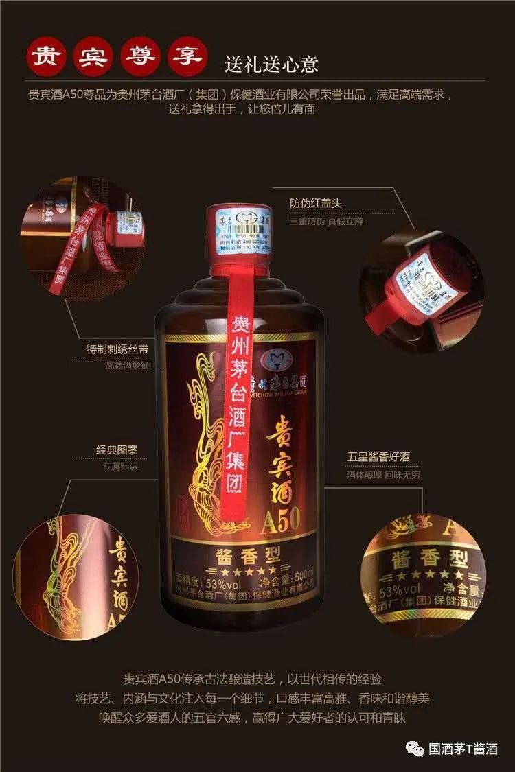 茅台贵宾酒A50尊品不是茅台股份生产的,是由茅台集团麾下的保健酒业有限公司生产的一款酱香型白酒。这款贵宾酒A50尊品是保健酒业有限公司采用传统酿造工艺酿制而成,口感正宗,具有酱香突出、幽雅细腻、味甘爽净、后味悠长的特点。这款贵宾酒A50尊品市场评价极高,是一款高品质美酒,顺应天地人和,农节时令,从制曲、制酒、贮存、勾兑到包装。一瓶贵宾酒从投料就经过30道工序和165个工艺环节的锤炼,至少要5年时间陈年老熟,这款酒适合商务宴请,过节送礼!