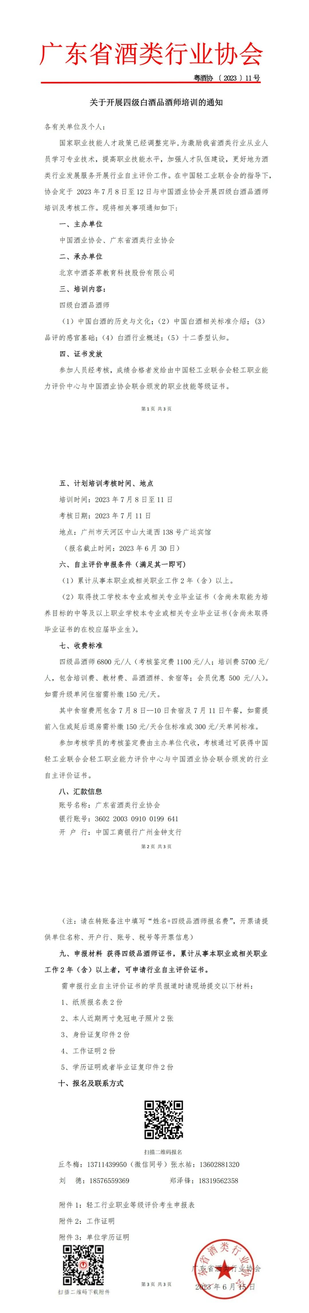 职业技能人才政策已经调整完毕,国家大力支持技能人才队伍建设工作,积极鼓励行业根据发展趋势及实际用人需求开展行业自主评价工作。为响应国家号召,为酒业发展服务,培养壮大人才队伍。在中国轻工业联合会指导下,中国酒业协会与广东省酒类行业协会将在联合开展白酒四级品酒师(广东)培训工作。1、累计从事本职业或相关职业工作 2 年(含)以上。2、取得技工学校本专业或相关专业毕业证书(含尚未取得毕业证书的在校应届毕业生);或取得经评估论证、以中级技能为培养目标的中等及以上职业学校本专业或相关专业毕业证书 (含尚未取得毕业证书的在校应届毕业生)。参加考核,成绩合格人员可获得由中国轻工业联合会轻工职业能力评价中心与中国酒业协会联合颁发的职业技能等级评价证书。四级品酒师 6800 元/人(包含培训费、考核费、教材费、品酒酒样、食宿等)。银行账号:3602 2003 0910 0199 641(注:请在转账备注中填写“姓名+四级品酒师报名费”,开票请提
