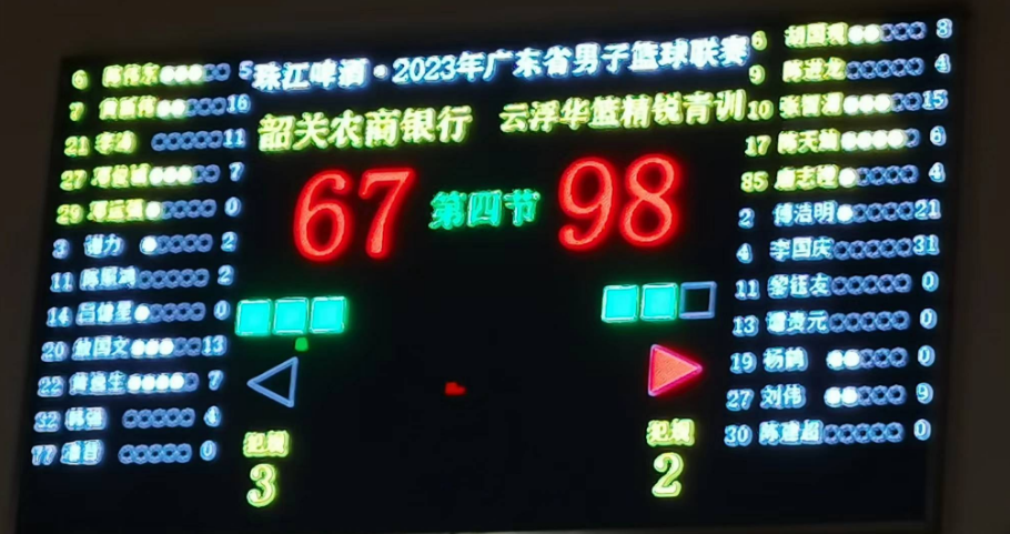 第四节一开局,云浮队接连进攻得分,把比分一下拉开到9分,韶关队则靠22号黄逸生的一技三分稍微“止血”。在体能上云浮队更胜一筹,在韶关队接连进攻未果的情况下,获得球权并快速上分,比分瞬间被拉开,全场比分67:98。