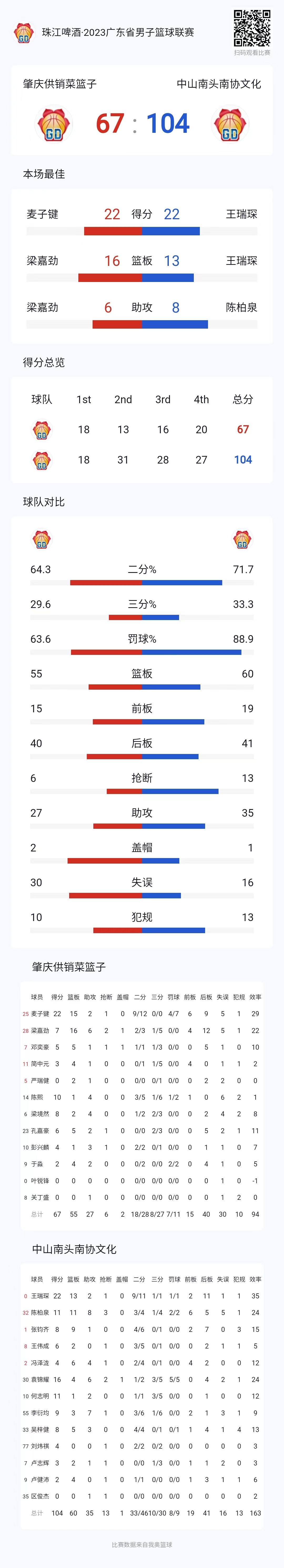 本场比赛小结,肇庆供销菜篮子:麦子键拿到22分15篮板 陈熙拿到10分1篮板