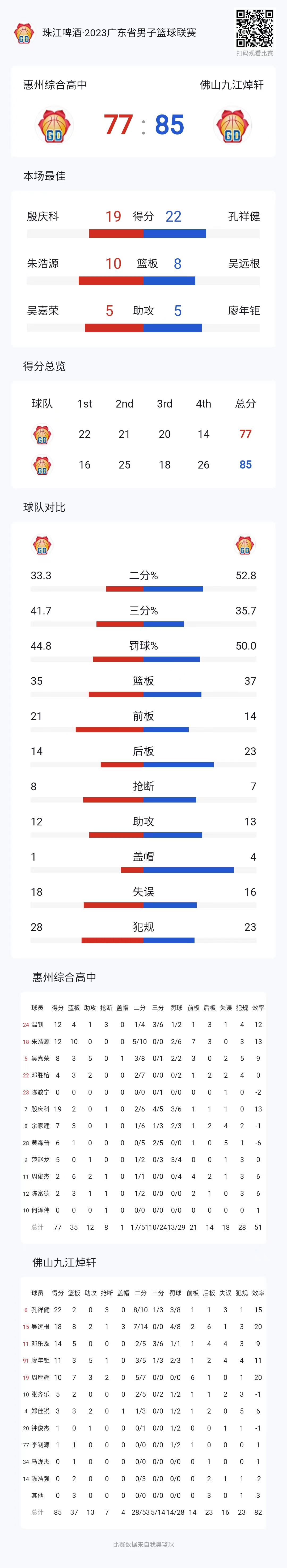 第四节开始,双方防守强度加大,惠州队开始陷入犯规麻烦,佛山趁机打出一波12:2,以74:68反超,这时佛山老将吴远根发挥定海神针的作用,佛山以经验控场,一直保持领先的优势,随着6号孔祥健三分入网,全场比赛结束,佛山队以85:77赢得比赛 。