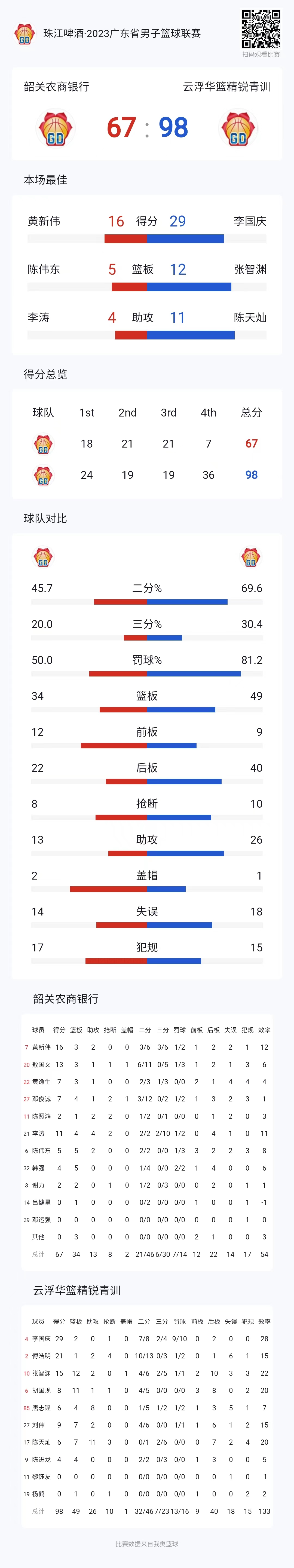 数据方面,河源队黄文威独得25分,6篮板,3助攻,曾冰强9分,21篮板