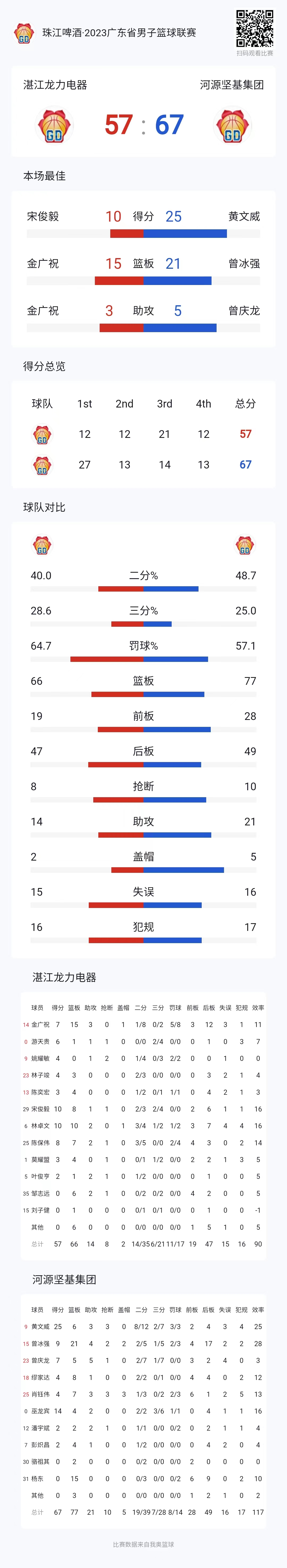 第四节比赛开始,河源队继续保持高强度的防守,湛江队疯狂反扑,但河源队顶住了压力不给机会,赢得了省联赛的开门红,最终比分定格在了57:67,河源队胜利。