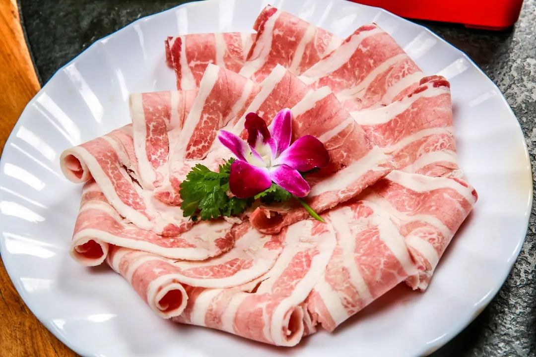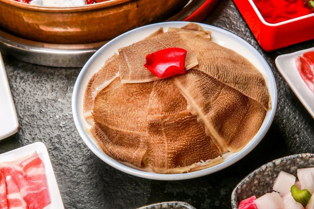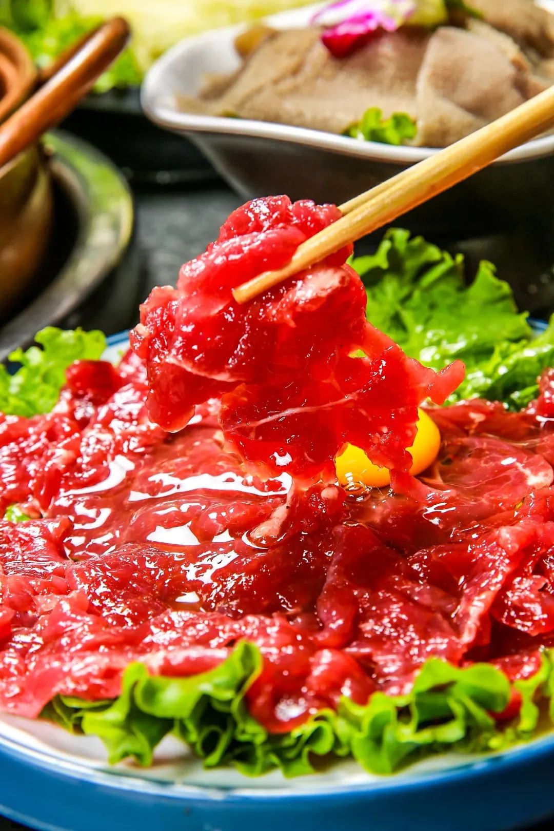 肥瘦比例适宜的肥牛,在火辣辣红锅中滚一圈,让牛肉裹满汤汁,辛香鲜辣间泛着肉香味,在料碟里涮一涮,嗯!令人唇齿生香的美味~