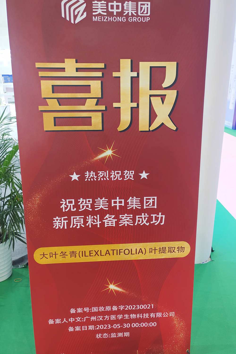 美中生物集团的展馆进口,摆放着一副巨大的喜报,上面的内容写着,祝贺美中集团新原料备案成功。CBO进一步从该公司了解到,该款新原料为大叶冬青叶提取物。该新原料成功备案,实现黄埔区“零”的突破,在一定程度上,它的到来,象征着美中集团迈向了更高的层次。