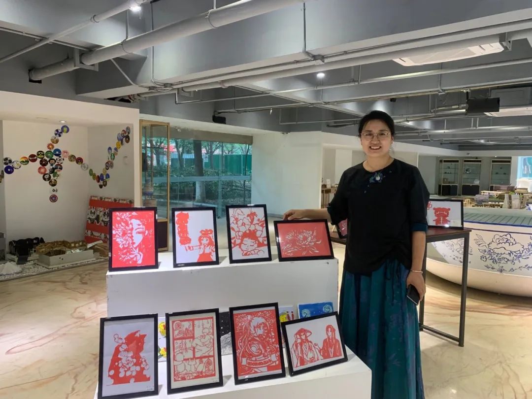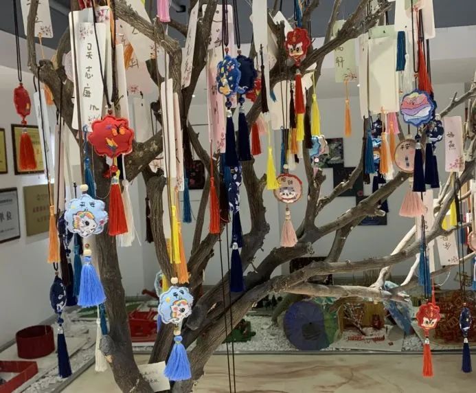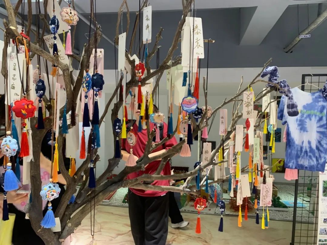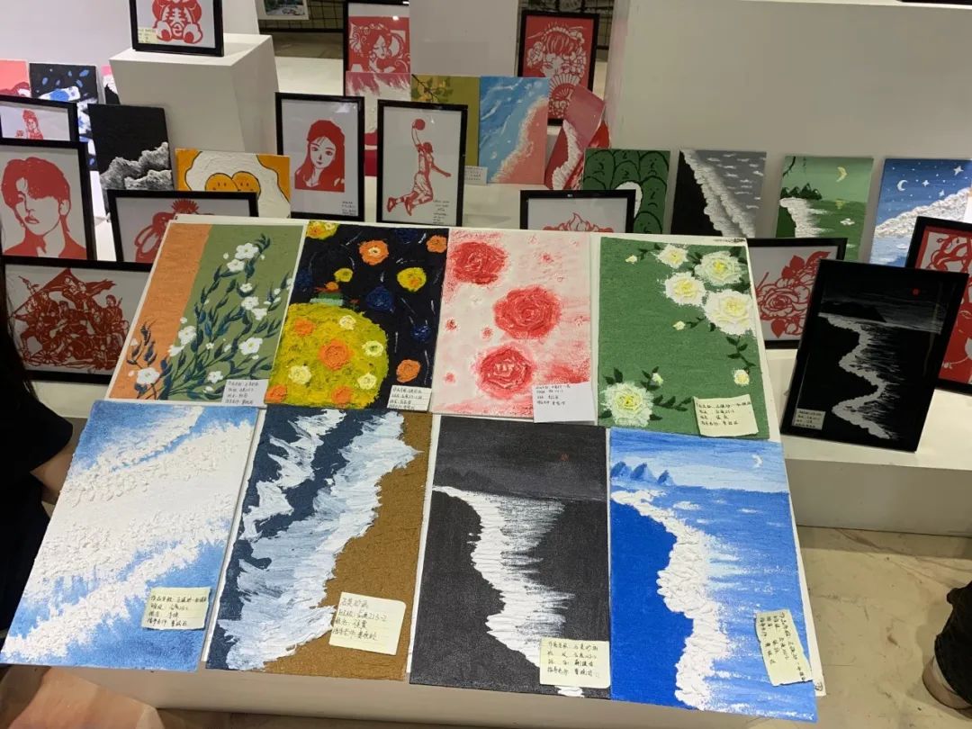 课程中体验了扎染技艺,创意肌理画,学习中华传统手艺剪纸、刺绣。在曹晓玲老师的教学下,去摸索、去创意、去完成,不知不觉中已经完成四项不同的工艺制作进行作品并进行作品展示。