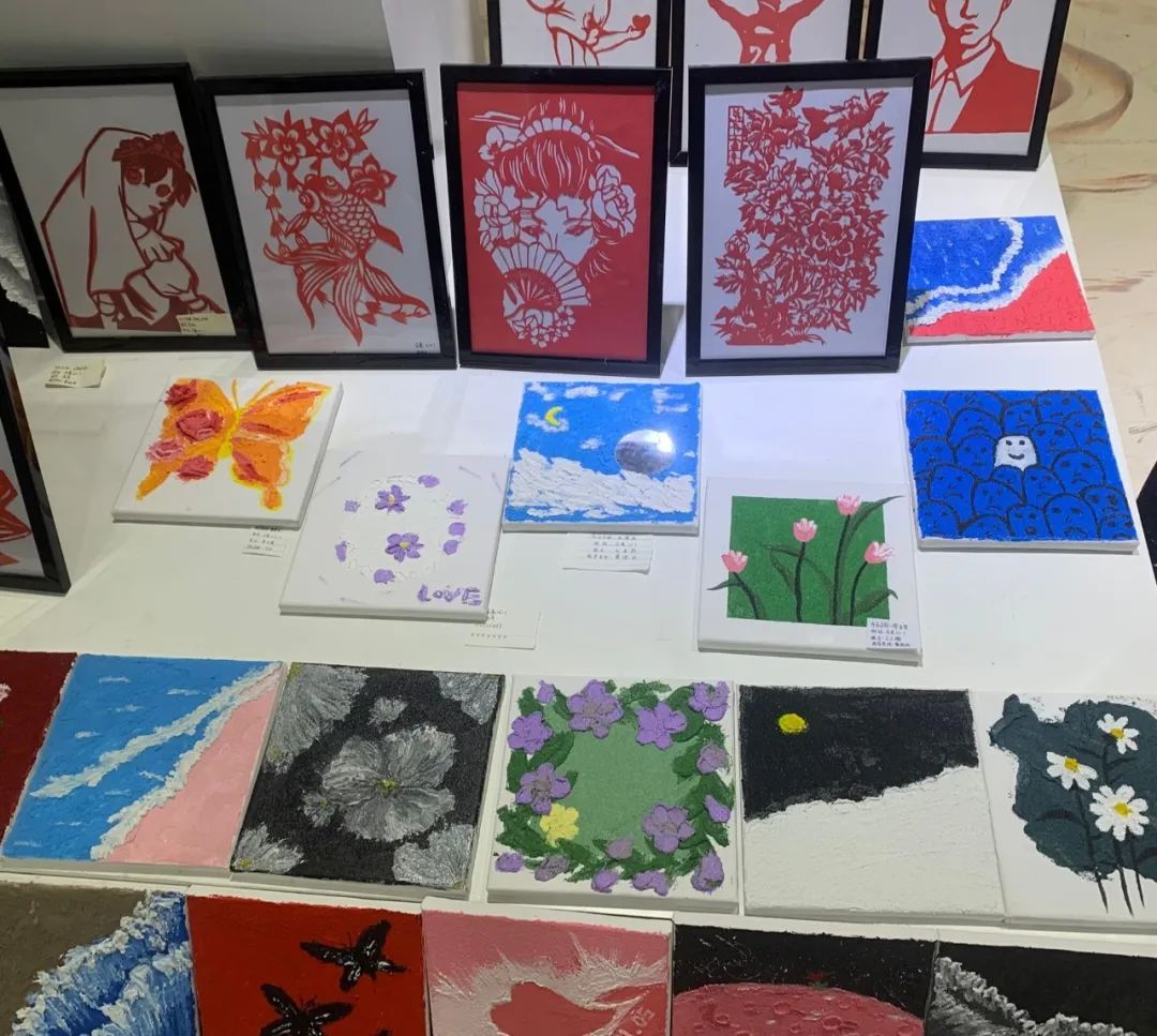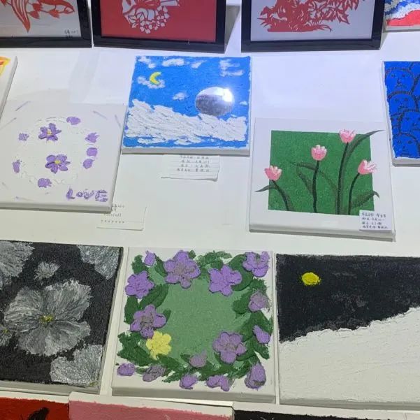 通过石英砂、丙烯颜料、小铲子等工具,根据个人的创意完成肌理画。
