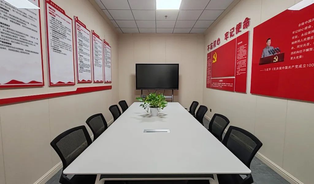 共享平台设施,包含多功能会议室、联合党建室、茶水吧、运动休闲区域等。