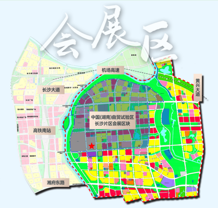 长沙会展新城定位为会议会展经济崛起展示区、自由贸易深度合作先行区、国际交往文化创意示范区,规划总用地面积约为27.4平方公里,其中长沙自贸会展区9.84平方公里。