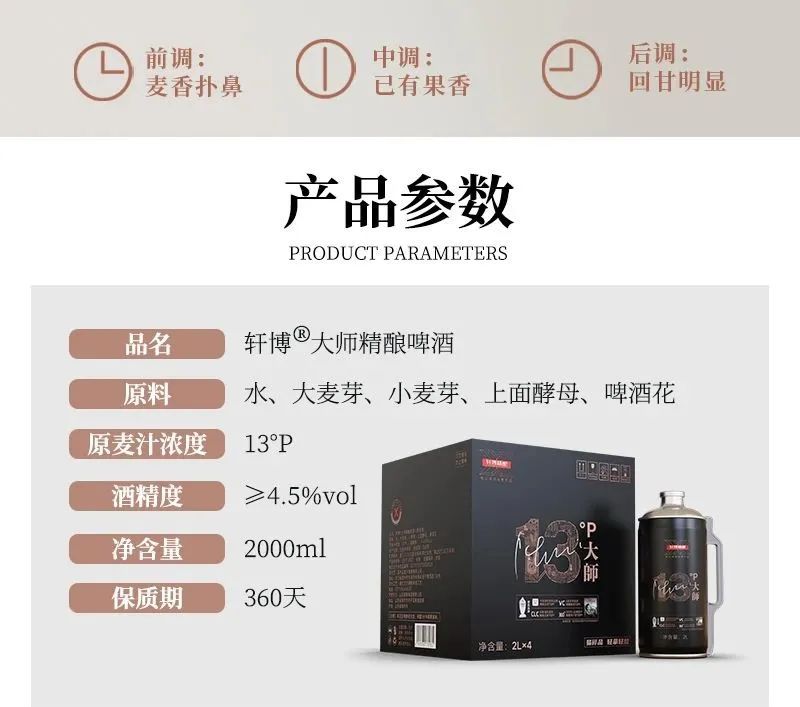 轩博在严格把控产品风味的同时,更是充分利用、发挥明星达人的带货效应!都说“一入精酿深似海,从此工啤是路人”,但很多人对精酿啤酒的初印象就是“贵”!但轩博走的却是平价路线!百元价格即可享受到精酿啤酒的馥郁风味!轩博大师精酿配料大方又干净,只使用小麦芽、大麦芽、啤酒花、上面酵母、水。精工慢酿、全麦芽发酵,麦汁浓度13°P,浓郁的麦香让人欲罢不能!干净透亮的琥珀色,黄宝石般的金色光泽,啤酒花浓郁绵密,口感像奶油一样丝滑!一阵凉气扑鼻,感觉一天的辛苦烦闷都被这一瞬间治愈了!嗅上一嗅,谷物原料的浓香馥郁充斥鼻尖,一口入喉,酣畅淋漓!大口喝下去的时候,嘴里充斥着麦芽和啤酒花的浓浓香气!喝着好喝的啤酒、同自己的三两知己一起谈天说地,这种感觉真的让人开心又满足!夏夜啤酒配烧烤,喝好喝的精酿啤酒,微醺不上头,这才更痛快!