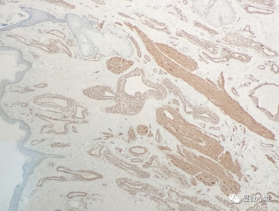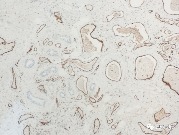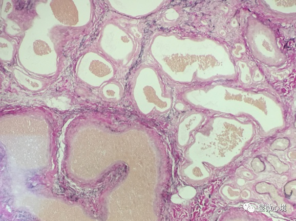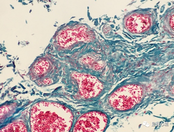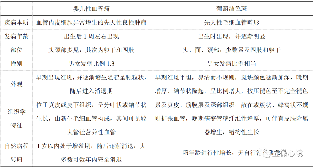 畸形管腔内皮细胞表达血管内皮相关标记,如CD31、CD34、ERG等,畸形管壁呈SMA、CollagenIV阳性,淋巴管相关标记如D2-40、LYVE-1、VEGFR-3呈阴性表达。图1免疫组化染色结果显示,畸形扩张血管内皮细胞呈CD34阳性表达,有助于清晰显示管腔分布范围及扩张程度 图2 免疫组化染色结果显示,畸形血管壁呈SMA阳性表达,有助于显示管壁厚度及管腔轮廓,其中内对照竖毛肌呈胞浆强阳性表达 畸形血管壁Masson染色呈绿色,个别管腔可夹杂少量红色,提示管壁内以纤维组织增生为主,含少量增生的肌纤维成分;弹力纤维染色显示畸形厚壁血管呈阴性,未见明确内弹力层,提示为增生的畸形静脉样管腔。图3 弹力纤维染色结果显示,簇状、蜂窝状畸形血管壁阴性,内对照少量皮下弹力纤维呈蓝色 图4 Masson三色染色结果显示,簇状、蜂窝状畸形血管壁呈蓝绿色,提示管壁内以纤维性成分为主 PWS作为以扩张性畸形血管为基础的疾病,需要与多种血管相关病变做鉴别,通常依据临床表现、外观特征、病史病程、年龄、发病部位、组织形态学(有无血管内皮细胞增生)、生长方式等可加以区分。对于婴幼儿(尤其是6月龄以内)、头面部红色斑块可考虑婴儿性血管瘤(临床习惯称该病为“婴幼儿血管瘤”)和早期PWS,但前者有瘤体明显增生现象,表现为逐渐隆起的鲜红色颗粒状斑块,外观似“草莓状”,而早期PWS在婴幼儿期呈平坦的红斑,病变随年龄增长成比例增大;自然病程上,前者瘤体多在数年后自行消退,后者则无自行消退现象;病理特征上,前者为新生毛细血管簇状或分叶状增生,小叶内或小叶间可见较大的营养性血管,属真性肿瘤,后者为畸形扩张的薄壁毛细血管,病变晚期可见簇状或蜂窝状畸形厚壁血管,但无血管内皮细胞增生(见表)。对于中老年人、头面部斑块,首先考虑为血管肉瘤,但需与晚期PWS相鉴别,前者常短期内快速生长,皮肤变薄,表面皮肤可溃烂,病变呈紫红色肿块样,可有卫星结节,后者呈紫红色斑块并结节状增厚,呈肿块样,亦可伴有皮肤溃疡,但病程较长,常出生时即存在并进行性增长;组织学上,前者肿瘤分化较好的可见不规则扩张血管腔隙呈浸润性生长,内皮细胞核大深染,向腔内突出,分化差的内皮细胞增生并具有异型性,核分裂象易见,并见片状梭形细胞或多边形细胞,后者不规则扩张血管呈错构样生长,管腔畸形,内皮细胞呈单层扁平状,无内皮细胞增生现象、细胞无异型性。对于中青年人所发生的血管畸形病变,需要区分畸形管腔的类型,最常见的为静脉畸形,可发生于浅表部位以及深部软组织,通常病变发展缓慢且处于静止状态,组织学多表现为不规则扩张的静脉腔穿插于脂肪、骨骼肌组织之间,常伴有血栓形成、机化。此外,PWS在临床上可单独发病,也可作为综合征与其他病变同时存在,诊断需与相应Sturge-Weber综合征及Klippel-Trénaunay综合征等相鉴别,Sturge-Weber综合征是一种皮肤神经综合征,特指PWS发生在三叉神经眼支支配区,并侵及软脑膜或蛛网膜,同时合并存在青光眼表现;Klippel-Trénaunay综合征是以皮肤大片红斑、静脉曲张及骨和软组织增生肥大三联症为主要表现,且皮肤大片红斑的病理基础常为PWS。表1 婴儿性血管瘤与葡萄酒色斑的临床及病理学特征对比