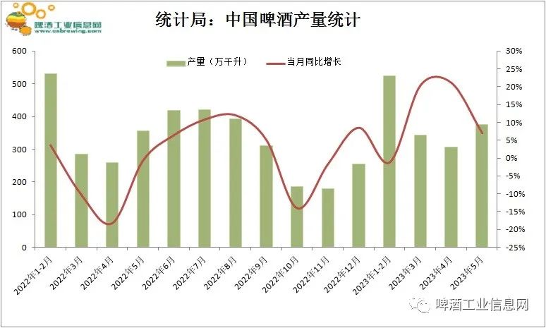 据中国统计局数显示:2023年5月,中国规模以上企业啤酒产量374.6万千升,高于上月305.9万千升,较去年同期356.7万千升(约5.0%),报告显示增长7.0%,同比略有偏差。
