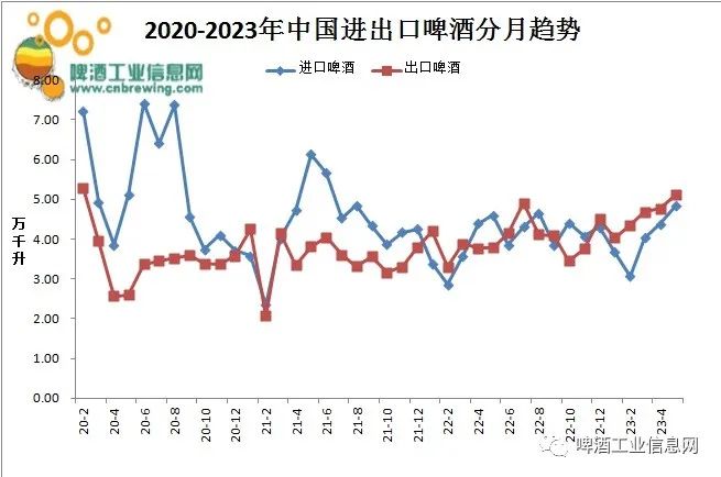 2023年5月,中国进口啤酒4.831万千升,同比增长5.0%;2023年1-5月,中国累计进口啤酒19.981万千升,同比增长6.4%。