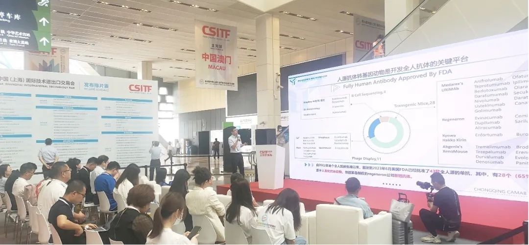 上交会现场,作为重庆生物科技企业,我公司走进上交会技术发布论坛,围绕公司全人源抗体小鼠(CAMouse),就抗体药物国际现状,以及掌握的多项核心技术和专利技术等进行了发布交流。