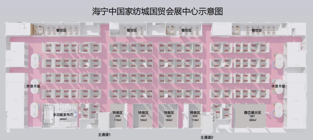 海宁中国家纺城国贸会展中心位于海宁中国家纺城国贸中心3号楼四楼,建筑面积12000㎡左右,会展中心内设有特标展位92间,并设有四个特装区,一个静态展示区,以及配套的餐饮区、休息区、多功能发布厅等。