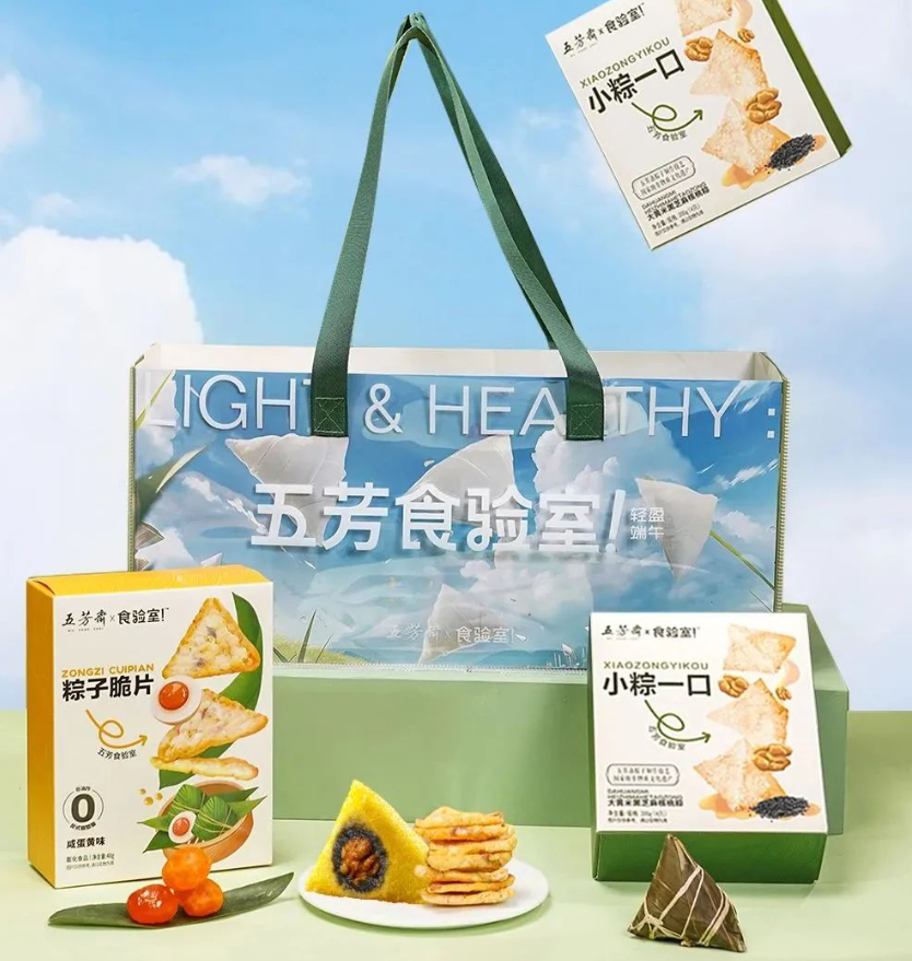 不仅如此,今年5月份,借势消费者对健康消费的追求,五芳斋联合健康零食品牌食验室推出“轻盈端午礼盒”。据介绍,礼盒内含大黄米黑芝麻核桃粽和咸蛋黄口味粽子脆片两盒产品。其中,大黄米黑芝麻核桃粽选用100%东北大黄米,加入芝麻和核桃仁;粽子脆片采用0油蛋白膨化工艺,咸香酥脆。